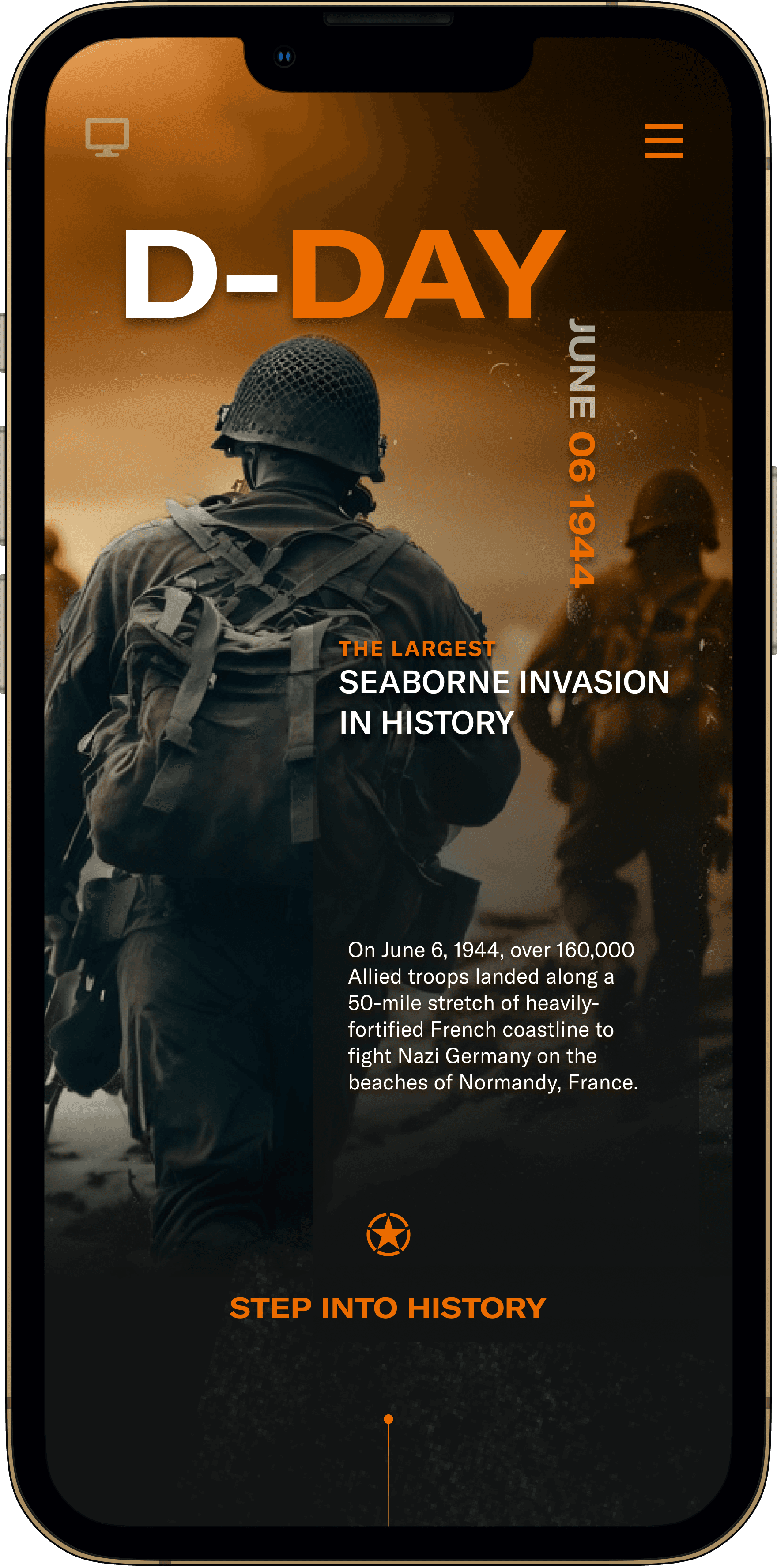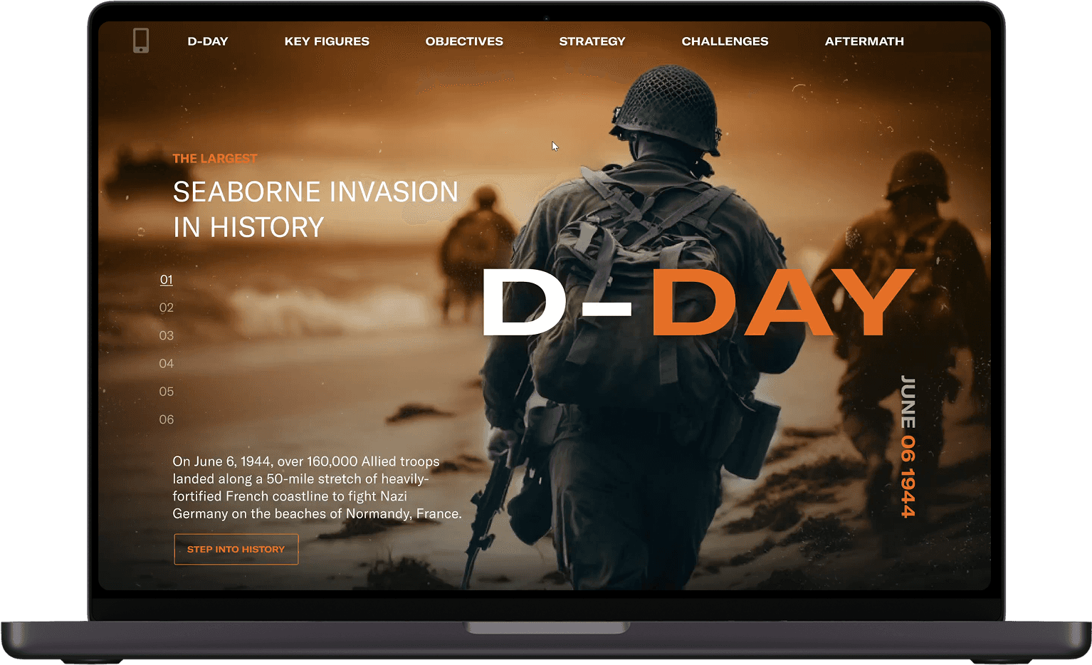 A web design project that honors the events of June 6, 1944. Focused on visual storytelling, the project presents historical information through archival imagery, interactive photo galleries, and written content that encourages reflection on the impact of war.