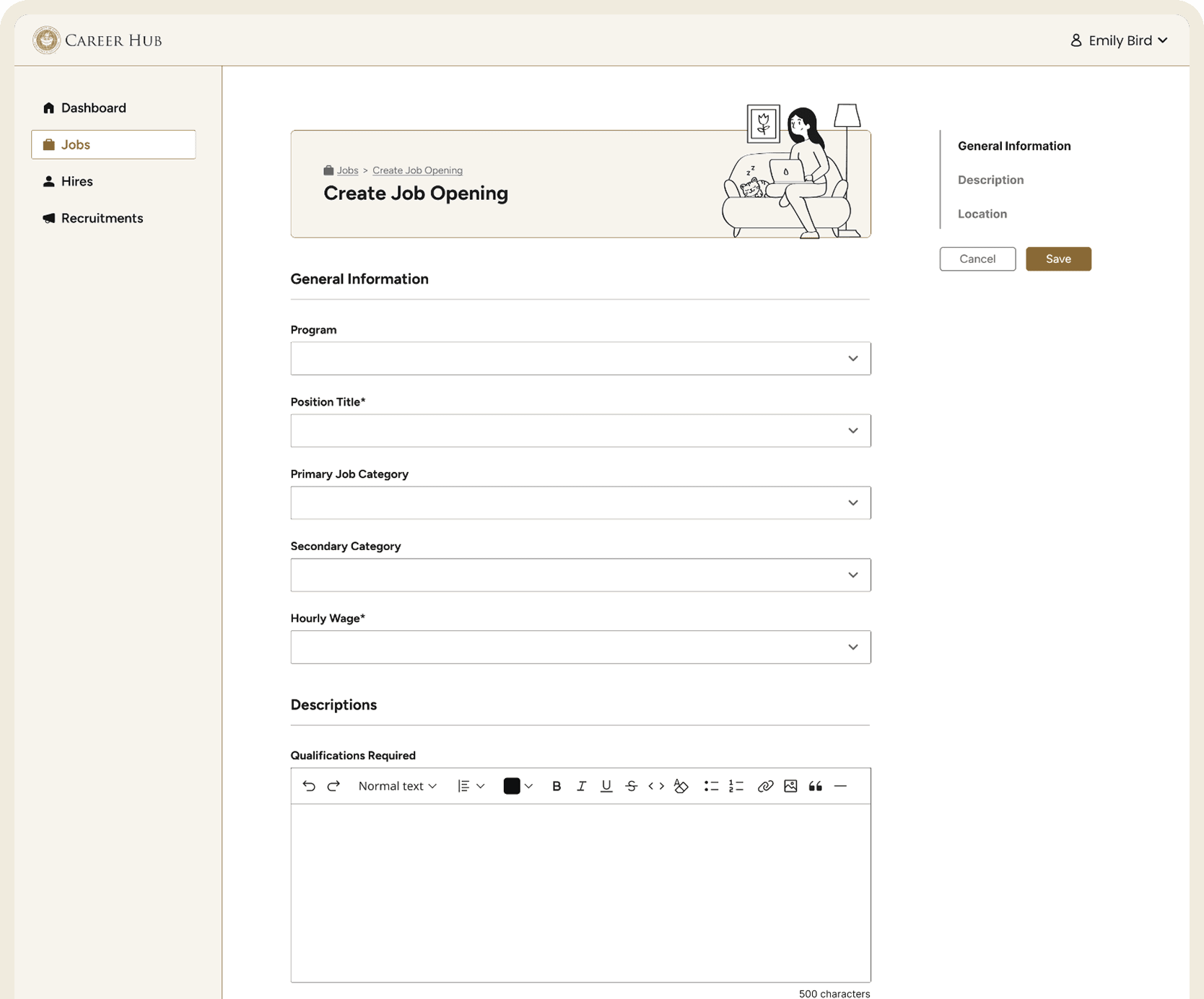 Manage job postings, track applications, and access recruitment tools all in one place with scannable stat cards and a live jobs preview table.