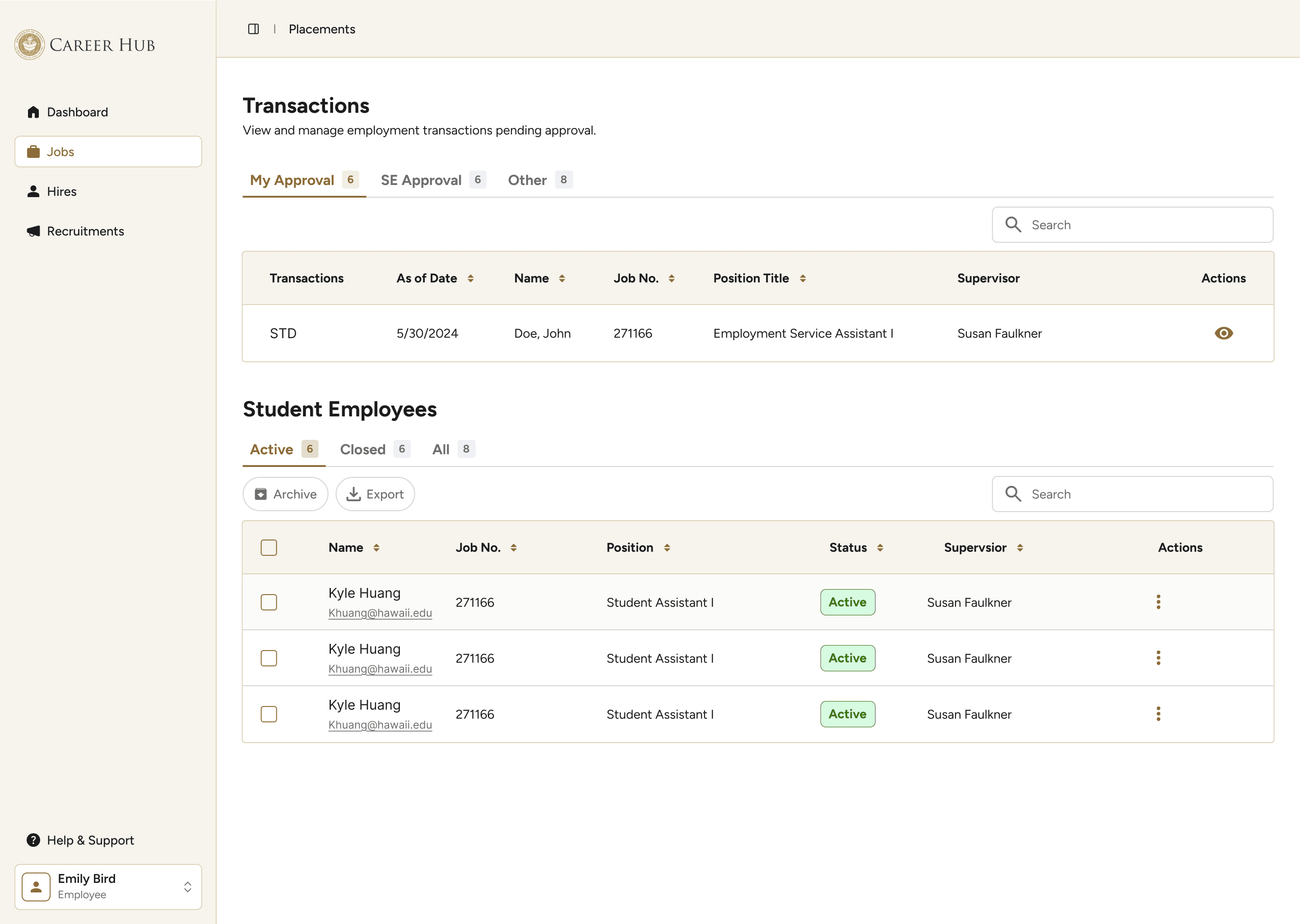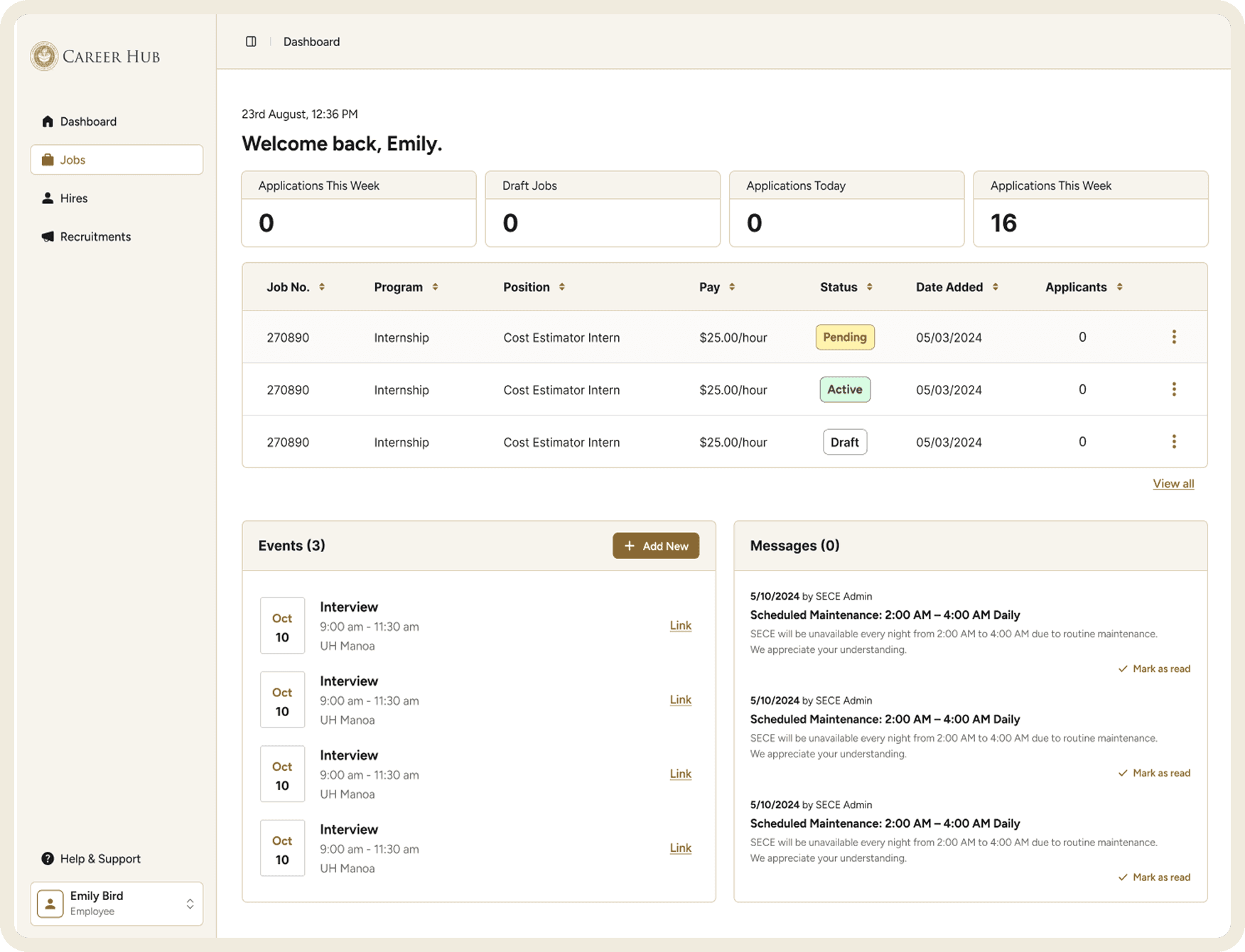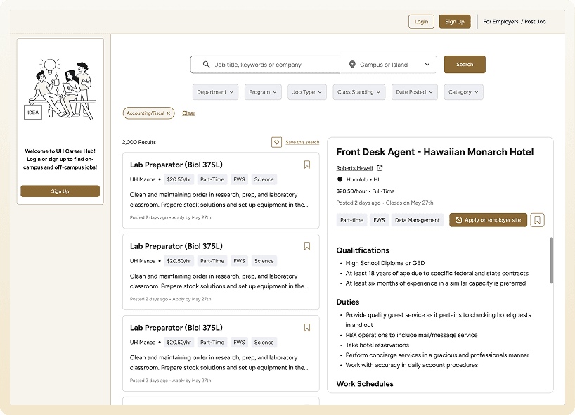 Student Employment and Career Exploration (SECE) is the University of Hawai'i's job platform connecting students across all ten UH campuses with on- and off-campus employers. During the summer, I redesigned the employer-facing experience and built a component library. The redesign is currently in development.