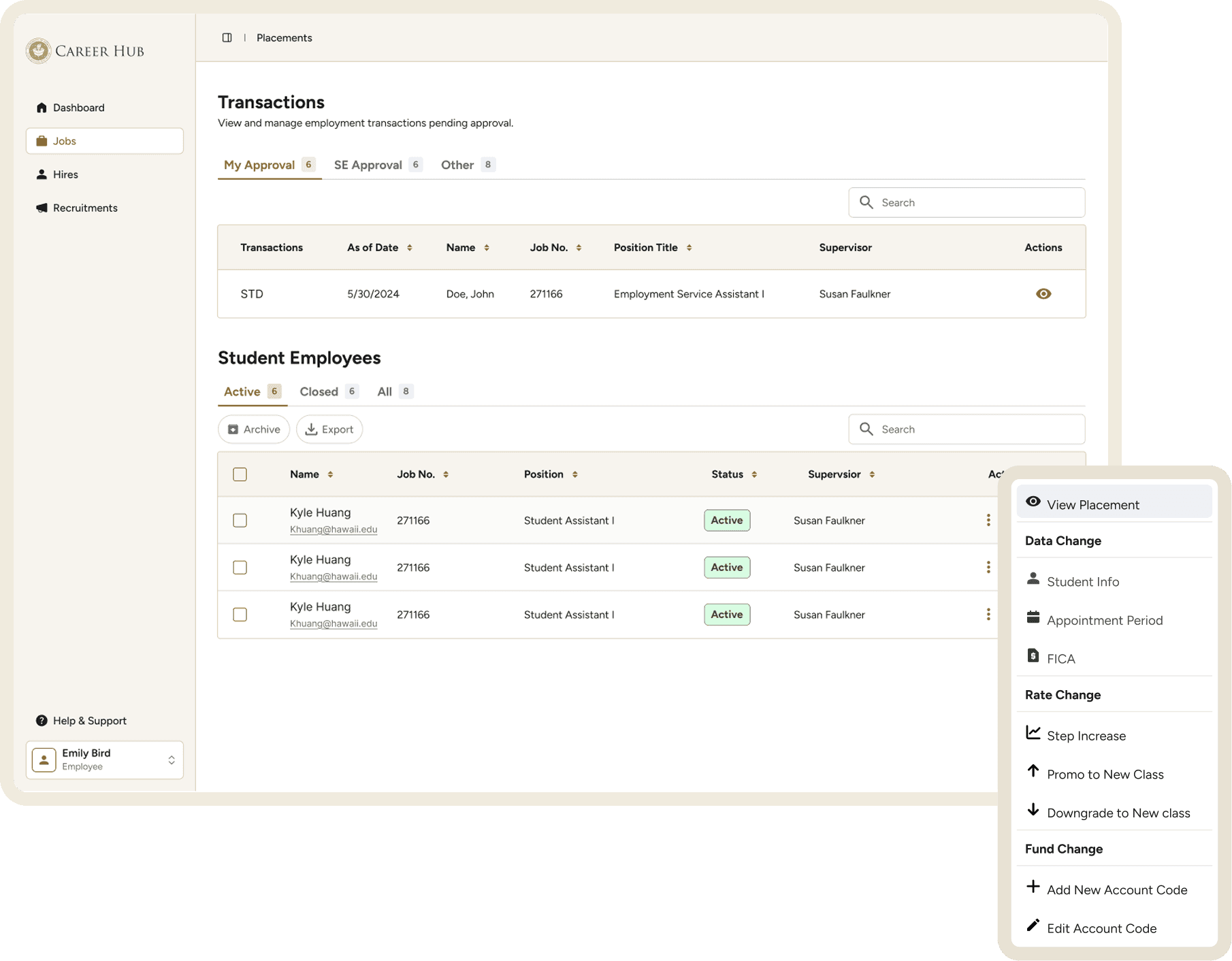 Actions now surface directly from the table via a three-dot menu with labeled categories and matching icons. A side modal handles all data edits so employers can make changes without losing their place in the table.