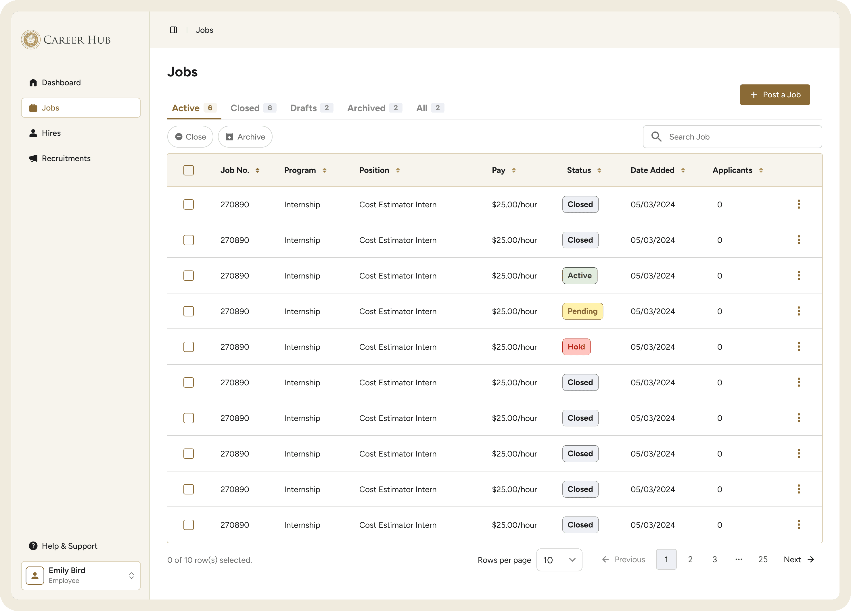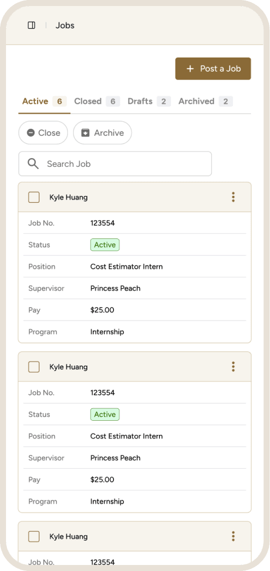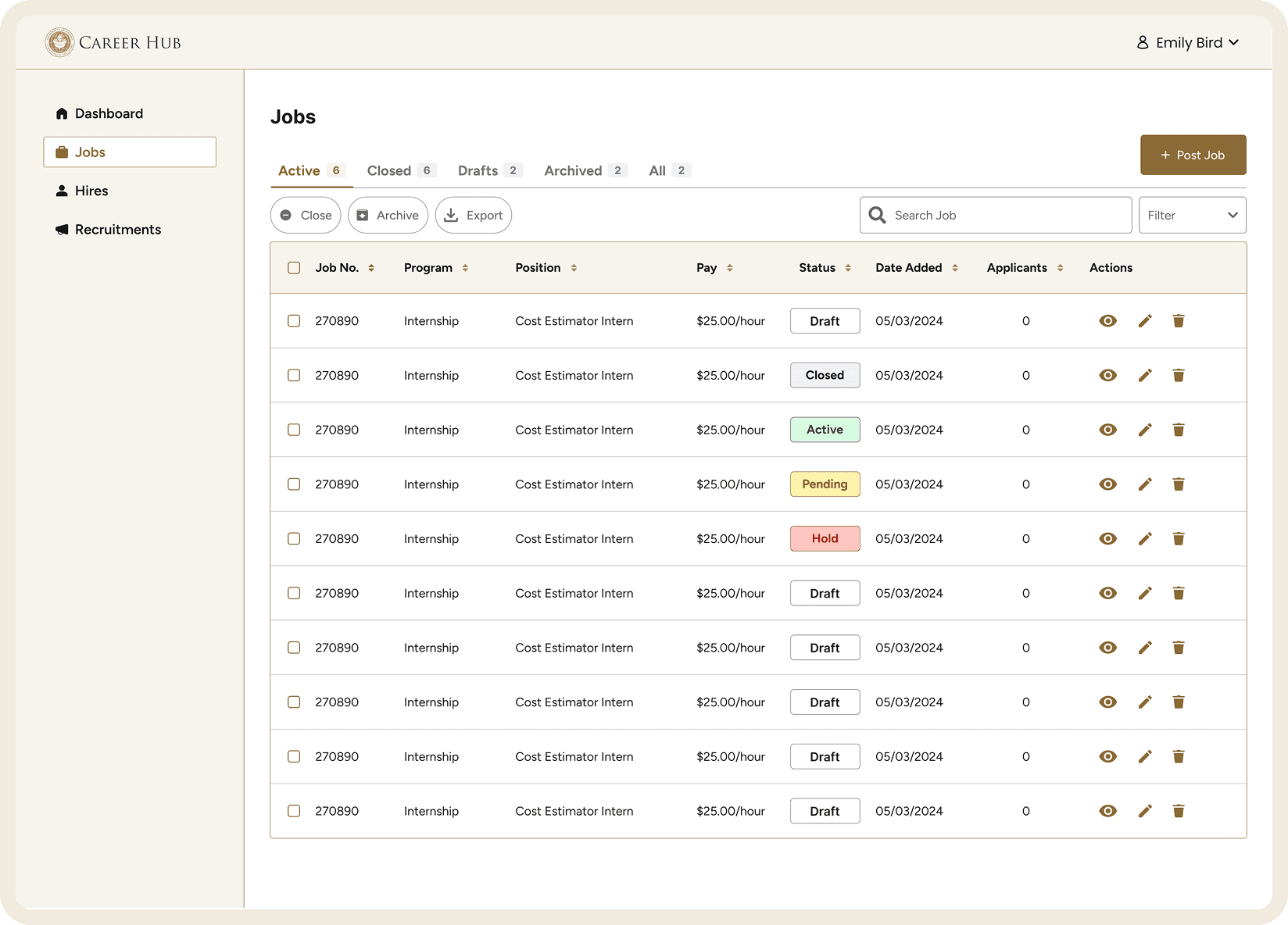 Color-coded status tags. Chevron on the Post a Job button so employers can choose what kind of job to post. Three-dot actions menu that consolidates all row-level controls in one place.